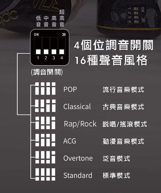為左加強四個頻段既契合性,qdc為V14加入左「相鄰頻段串擾抑制」同「相位補償」兩項專利技術,前者可以確保每一個開關都只會作用於自身既頻段範圍,而唔會干涉到其他頻段既輸出曲線;後者則可以移除多單元耳機常有既相位抵消問題,以此保持全頻連貫順暢。